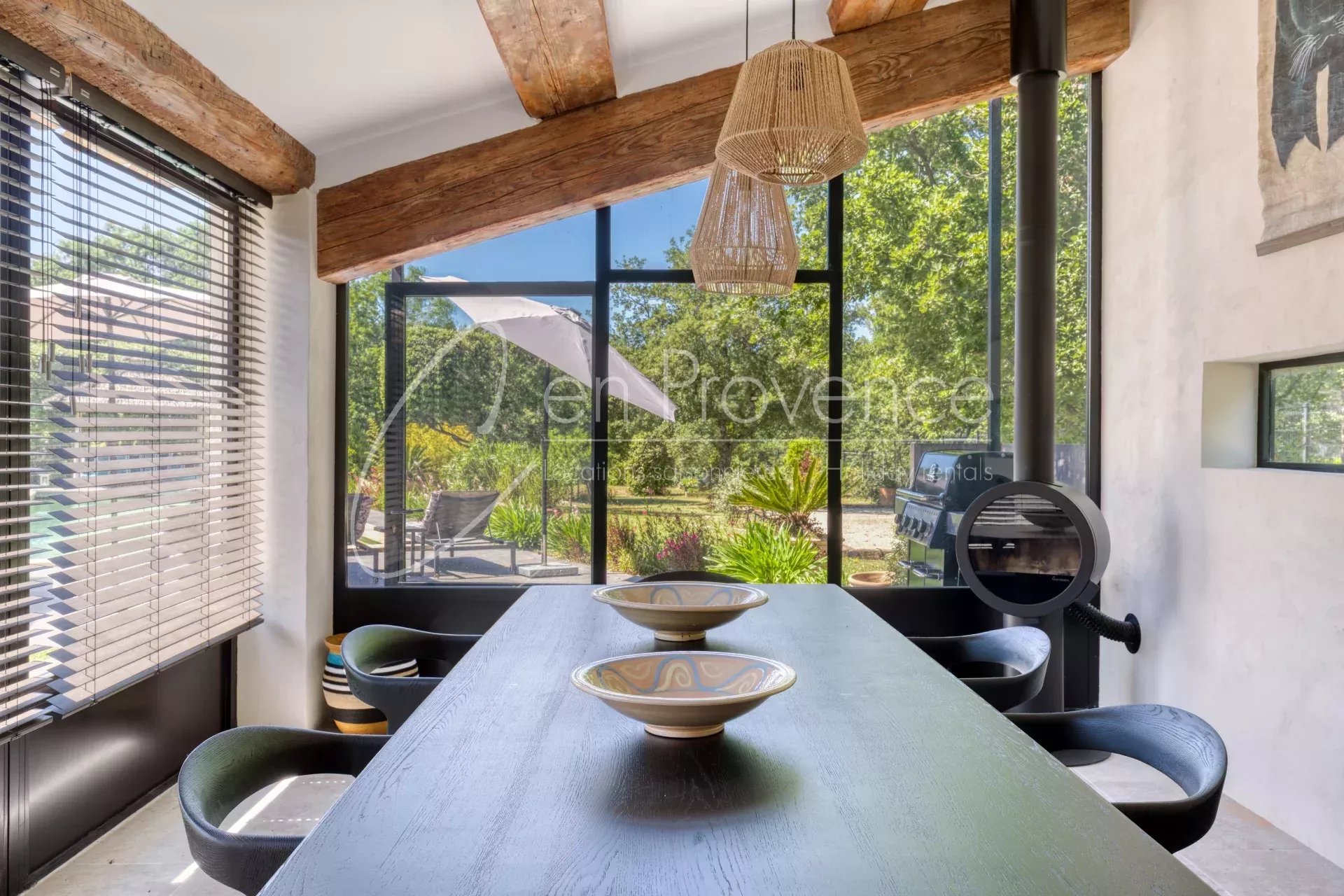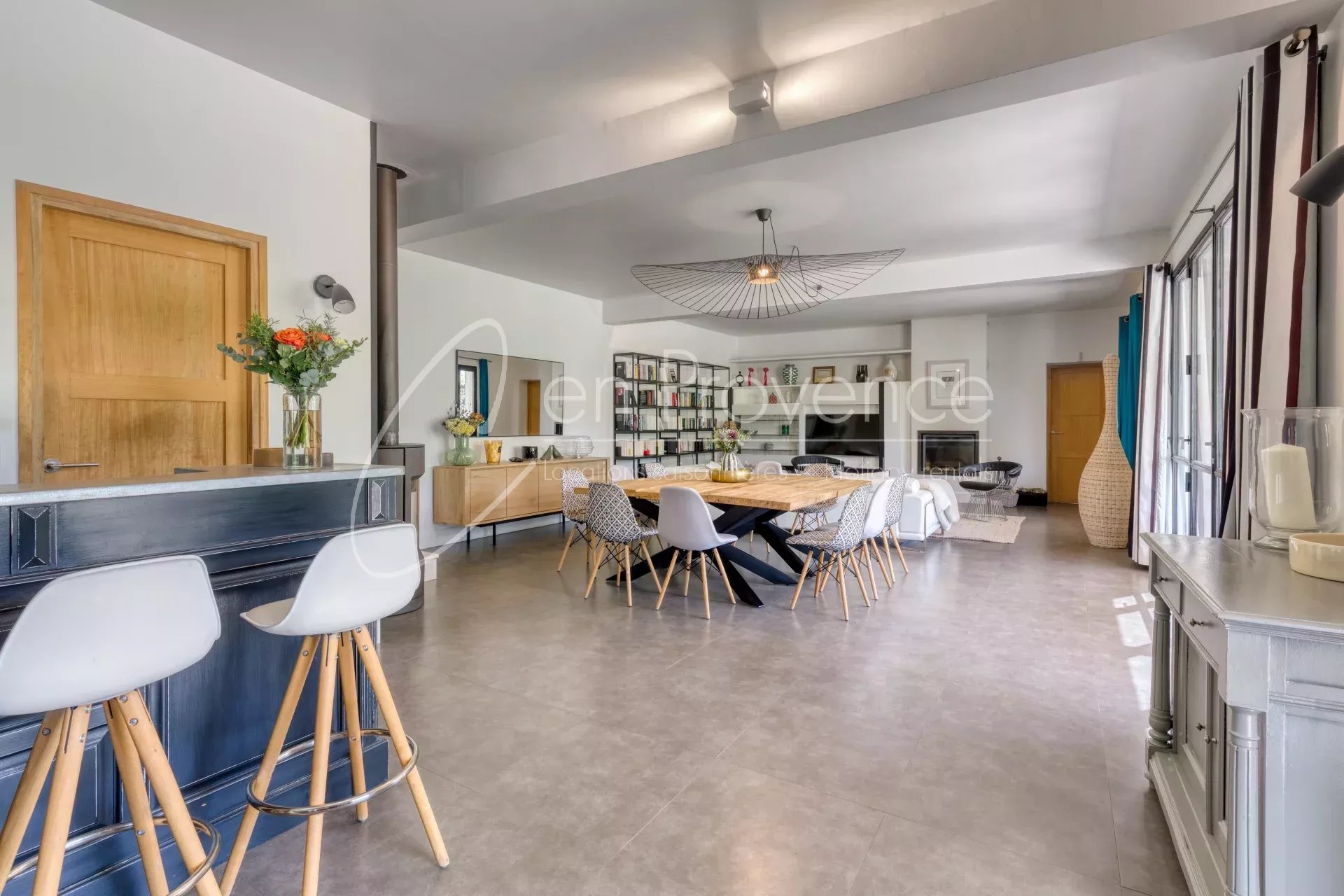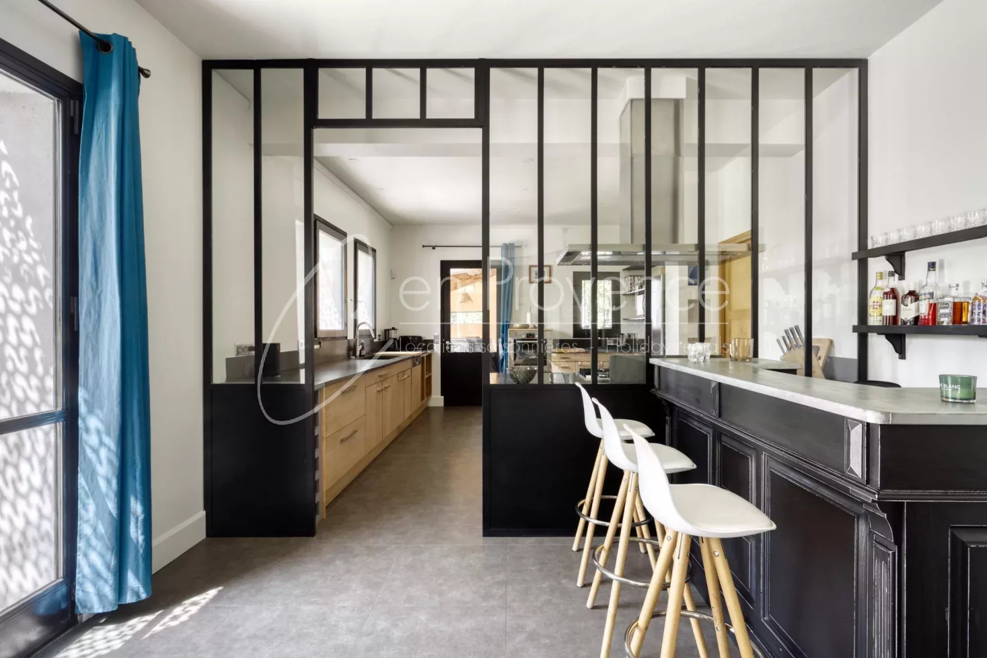 Pour les intérieurs, la propriété dispose d’un grand séjour avec espace salon et salle à manger puis une belle cuisine parfaitement équipée donnant accès à une autre terrasse couverte. Toujours en rez-de-chaussée une chambre avec une salle d’eau.